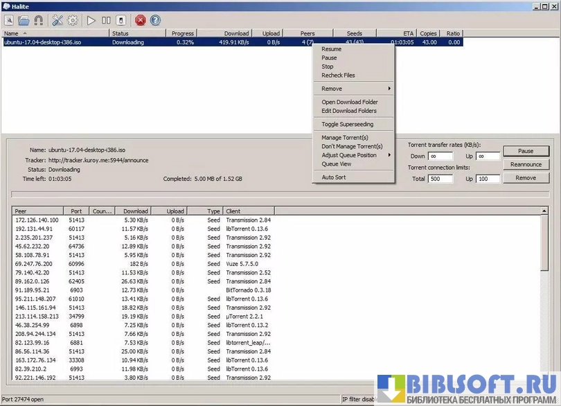 - ограничение скорости закачки и раздачи для каждой загрузки;