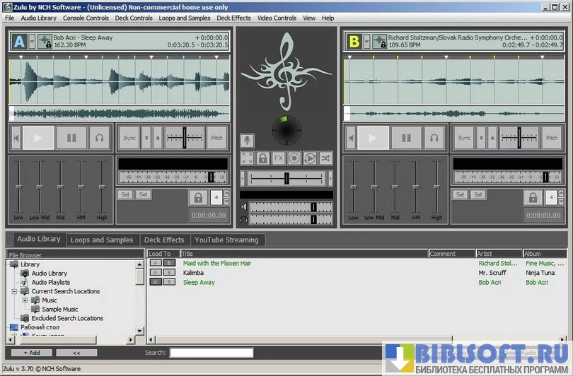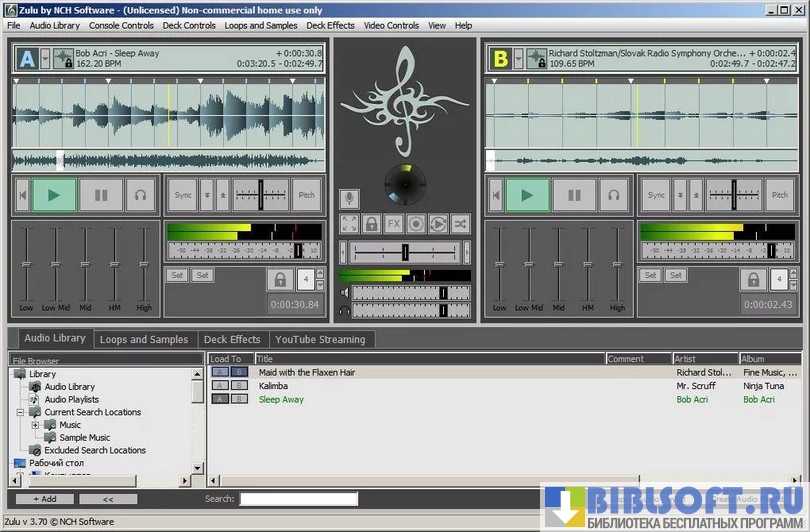 Zulu DJ – функциональная диджейская утилита для микширования треков. Ритм определяется автоматически, что обеспечивает плавные и точные переходы. Интерфейс предусматривает 2 «вертушки», в которые можно загружать композиции. Делайте закладки на определенном месте композиции и возобновляйте проигрывание с него.