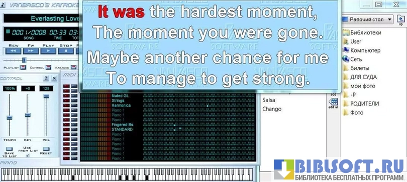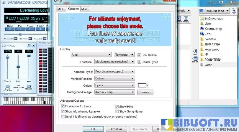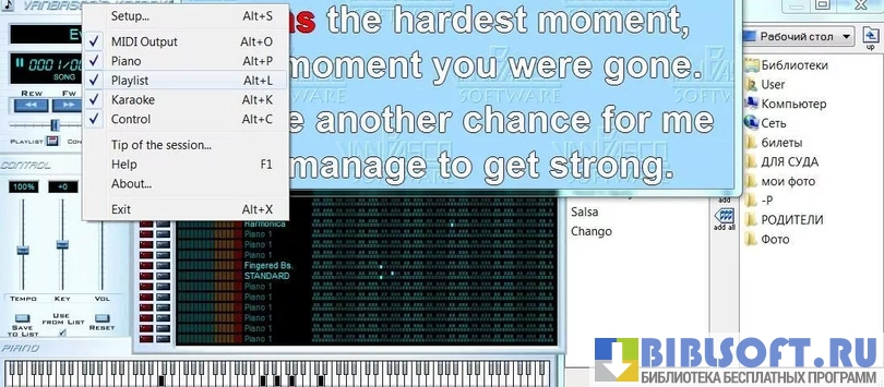 VanBascos Karaoke Player – интерактивный караоке-плеер для Windows. Умеет воспроизводить караоке-файлы в .rmi-, .midi-, .mid- и .kar-форматах. Может изменять звучание воспроизводимых файлов в режиме реального времени, с помощью интегрированного синтезатора.