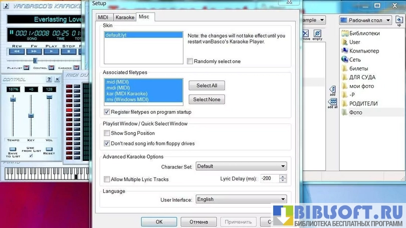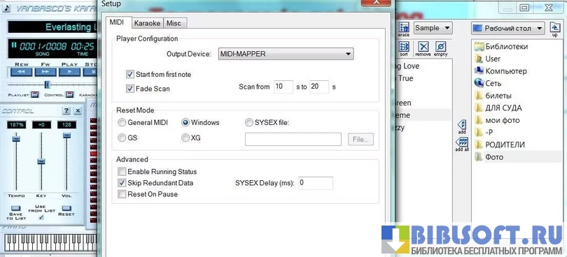 - Подгружает выбранные локальные или записанные на CD-диске караоке-файлы в .rmi-, .midi-, .mid- и .kar-форматах в собственную TEMP-директорию, выводит их в интерфейс в виде списка;