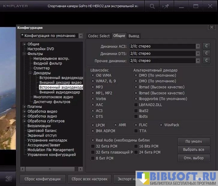- автоматическое определение недостающих для проигрывания видеофайла кодеков, их установка;