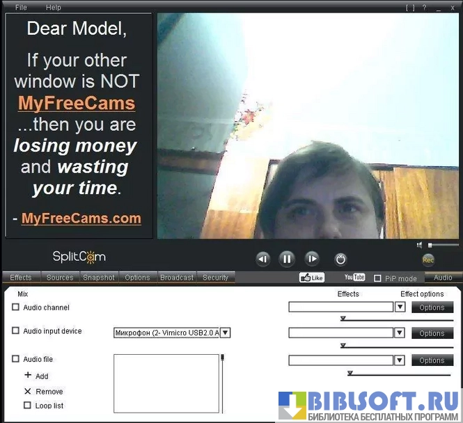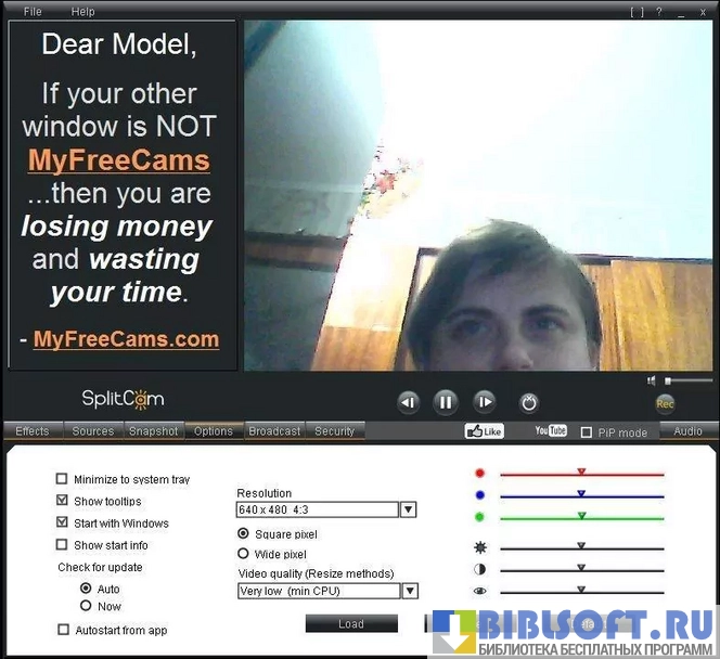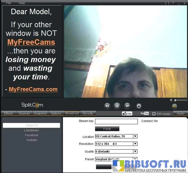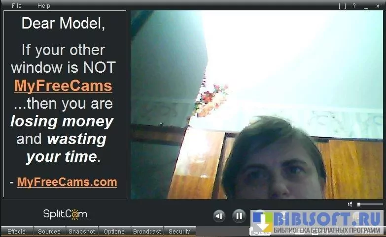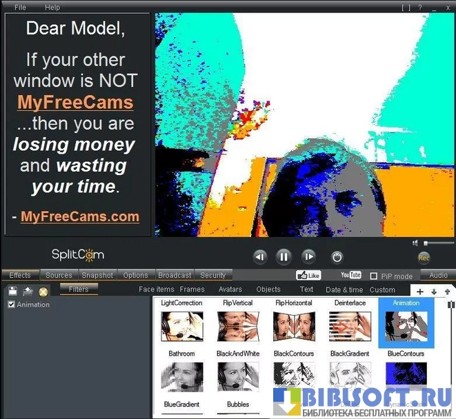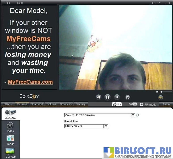 SplitCam – эмулятор графических эффектов веб-камеры для Windows. Позволяет «накладывать» визуальные эффекты на видеопоток веб-камеры в режиме «реального времени». Поддерживает большинство существующих веб-камер, возможность синхронизации с различными «онлайн-сервисами видеообмена» и/или установленными в систему видео-мессенджерами.