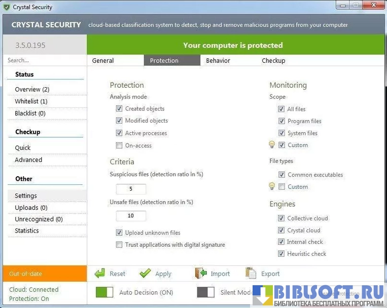 Работа приложения основана на анализе исполняемых процессов операционной системы. Для хранения базы вредоносного ПО используется облачное хранилище, куда отправляются данные со всех компьютеров с установленным Crystal Security. Благодаря такому алгоритму сигнатуры регулярно обновляются, и любая возможная угроза становится известна в кратчайшие сроки после ее возникновения. Утилита эффективно борется с: