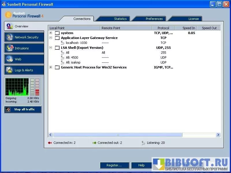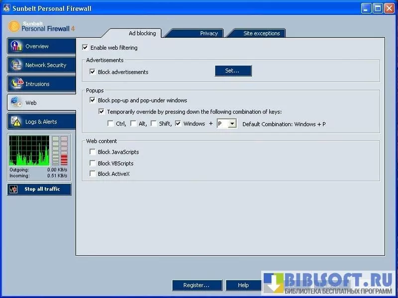 Sunbelt Personal Firewall – сетевой фильтр для Windows с несколькими предустановленными уровнями безопасности. Может использовать при работе как «стандартные», так и «произвольно-задаваемые» пользователем уровни безопасности.