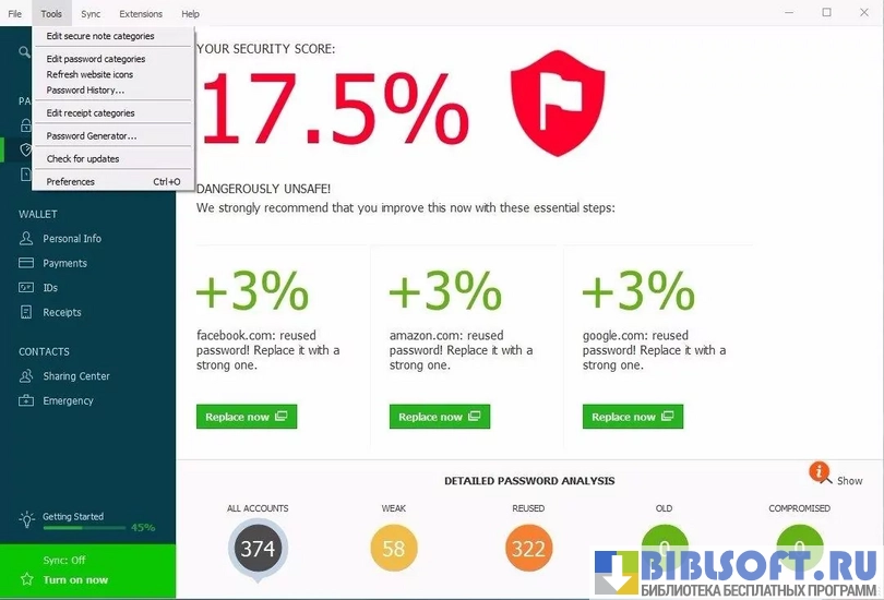 Программа умеет проводить мониторинг системы на наличие паролей и оценку их надежности, а также генерировать надежные сложные пароли, которые будет трудно взломать.