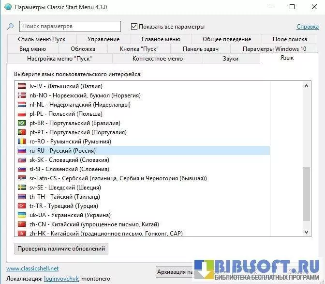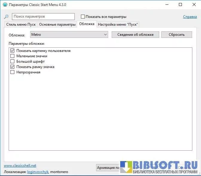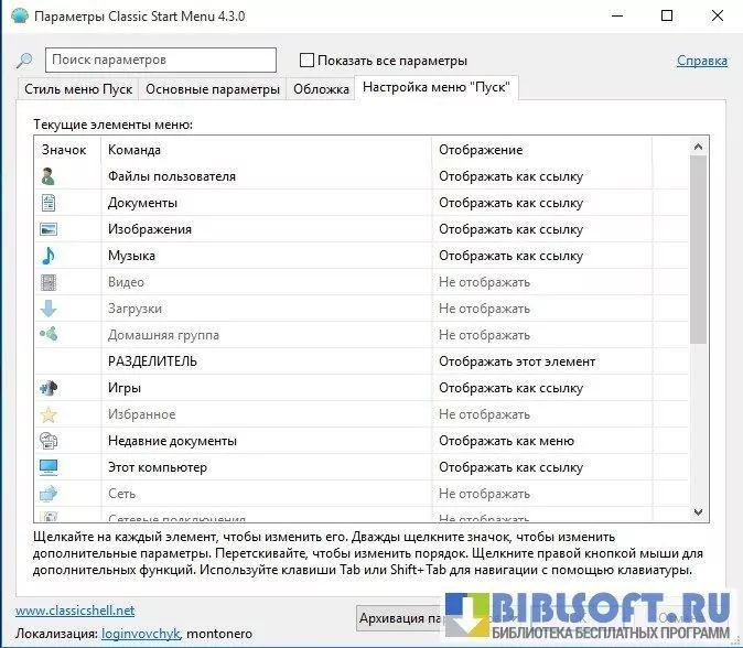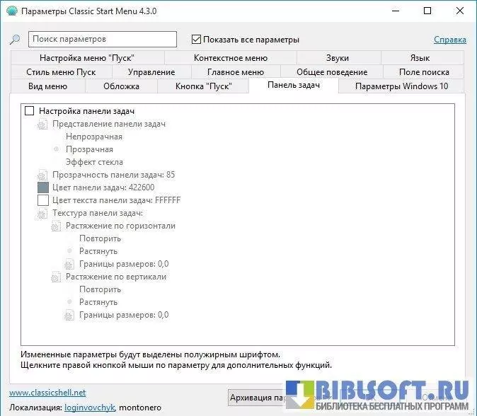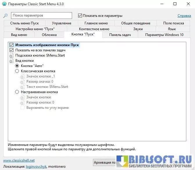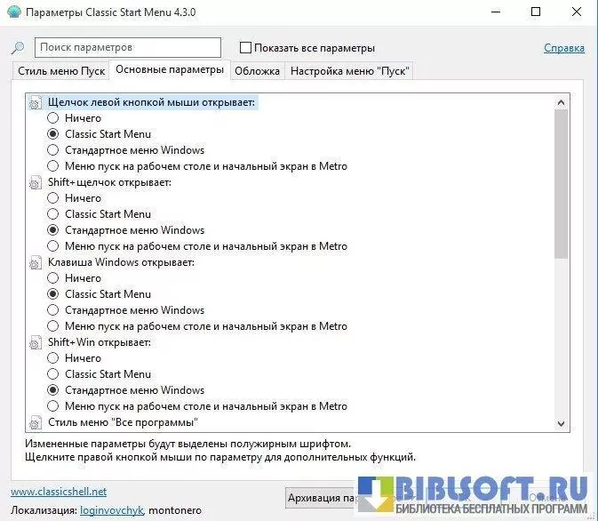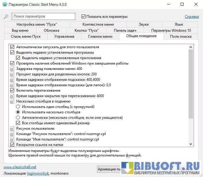 Приложение Classic Shell имеет 15 вкладок с настройками, позволяющими настроить практически каждый элемент меню «Пуск». Внесенные в настройки изменения можно сохранить в файл, чтобы воспользоваться им позднее или использовать готовый файл для изменения настроек.