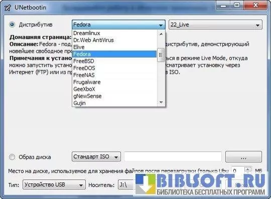 Утилита работает как с дисковыми накопителями, так и с ISO-образами. В последнем случае можно сделать загрузочную флешку отсутствующей в списке ОС. При выборе дистрибутива из списка утилита предоставляет ссылку на его домашнюю страницу, где пользователь может почерпнуть больше информации и принять решение о необходимости его установки. Возможна закачка дистрибутива, если он отсутствует на компьютере или дисковом носителе. UNetbootin не требует инсталляции на HDD компьютера и работает в portable-режиме.
