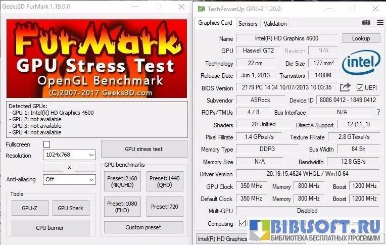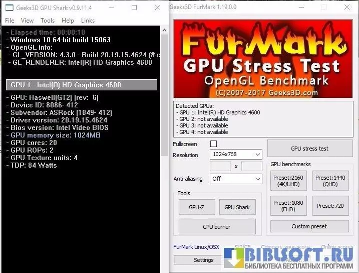 Утилита корректно работает с большинством моделей видеокарт (включая интегрированные), при условии поддержки ими API OpenGL.