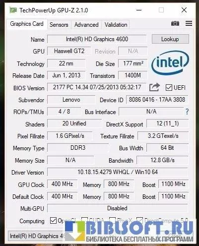 В считанные секунды после запуска программа предоставляет всю информацию о графическом адаптере, интерфейсе подключения, номере ревизии чипа, частоте в разных режимах, информацию о DirectX и все доступные данные, позволяющие узнать характеристики видеопамяти.