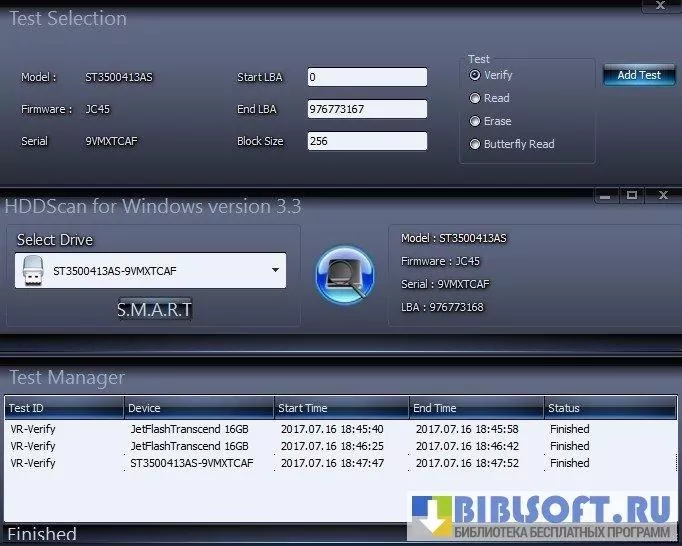 - Поверхностное тестирование: последовательное и случайное чтение/верификация с подсветкой проблемных секторов, мультискоростные сканы (короткий/длинный тест).