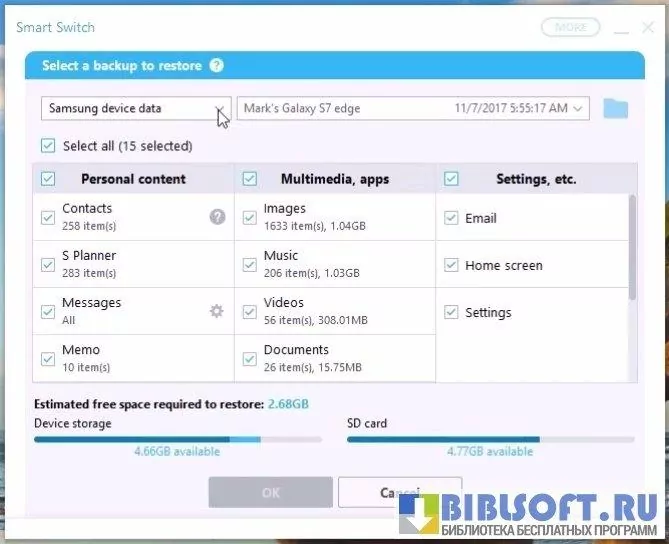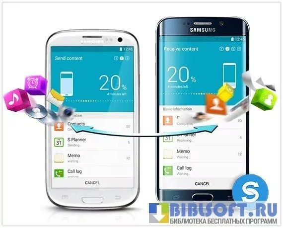 - обмен информацией и файлами между смартфонами Samsung и ПК (мультимедиа-контент, контакты, заметки, сообщения, календарь, журнал вызовов, исполняемые файлы и т.д.);